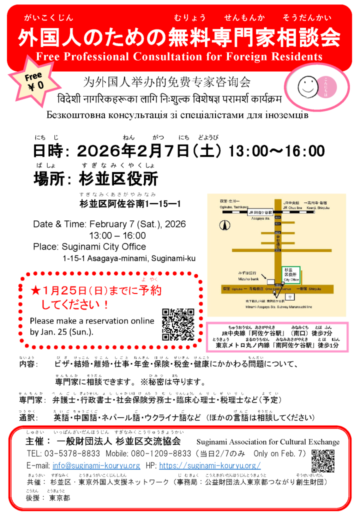 【2026年2月 7日 土曜日】杉並区で 外国人のための 相談会が あります。
