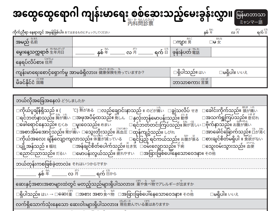 အောက်ပါစာမျက်နှာမှ ဒေါင်းလုတ်ဆွဲပါ။https://kifjp.org/medical/ (ဘာသာစကား 23ခု)