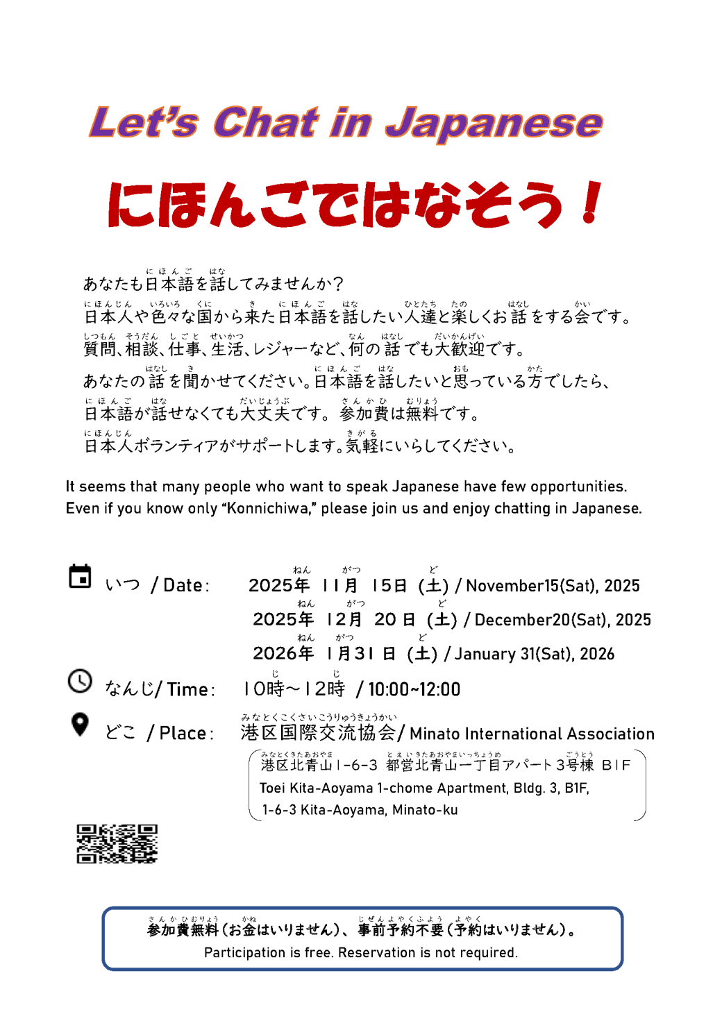 “Let’s chat in Japanese ” is a monthly community where you can meet new people and practice your Japanese at the same time.