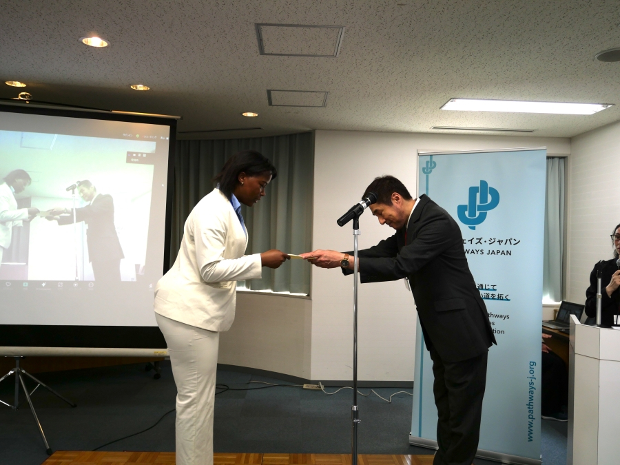 A scene from a scholarship award ceremony. Each scholarship recipient gave a speech about their experiences and aspirations for the future.Photo Courtesy: Pathways Japan