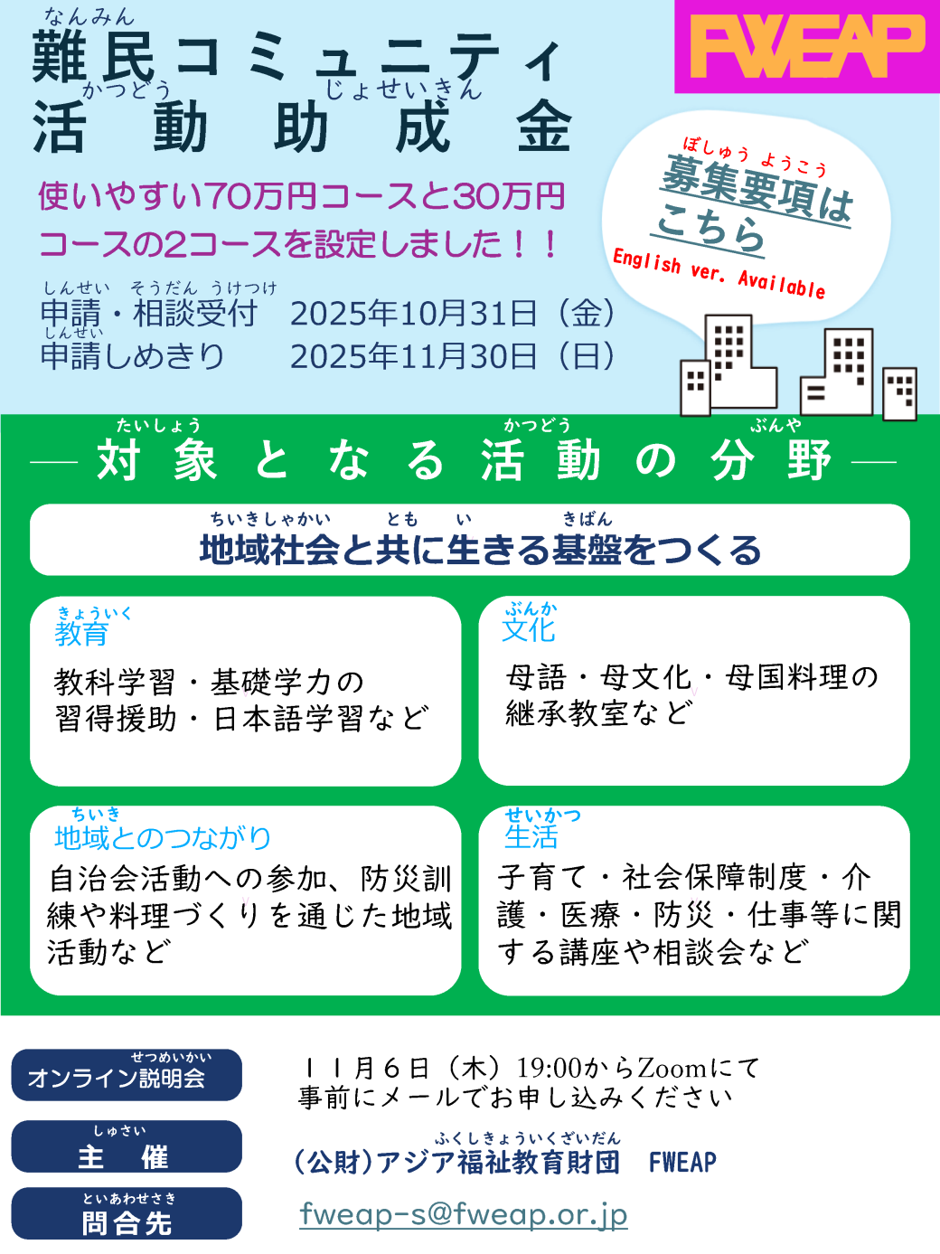 2026年度資金援助事業~難民コミュニティ活動助成金~助成対象事業募集のお知らせ