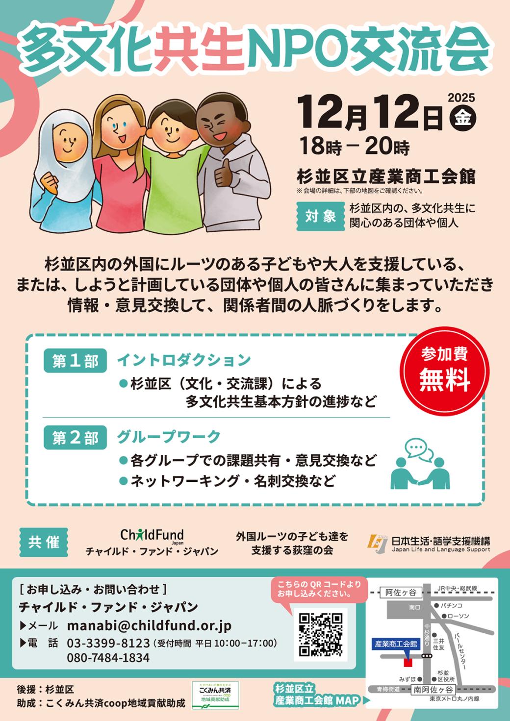 杉並区内で外国ルーツ住民を支援している、またこれから支援を始めたい団体・個人が集まり、課題やニーズを共有し、連携のきっかけをつくることを目的に「多文化共生NPO交流会」を開催します。