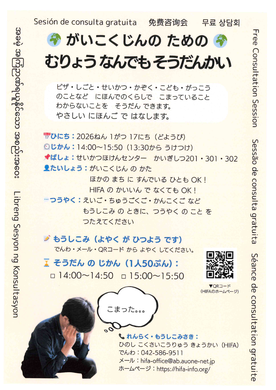 | 日時 | 2026年 1月 17日(土曜日)14:00~15:50 ※受付は 13:30から 相談の 時間(一人 50分):①14:00~14:50、②15:00~15:50 |