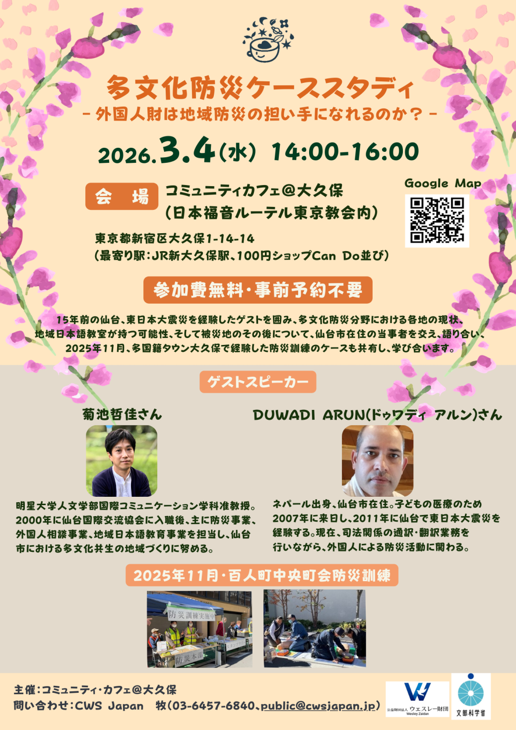 東日本大震災から15年、発災当時、仙台で震災を経験したゲストを囲み、多文化防災分野の現状、地域日本語教室の可能性、その後の仙台市内の外国人住民について学び合います。そして、2025年11月に多国籍タウン大久保で開催した防災訓練の教訓と課題を共有します。