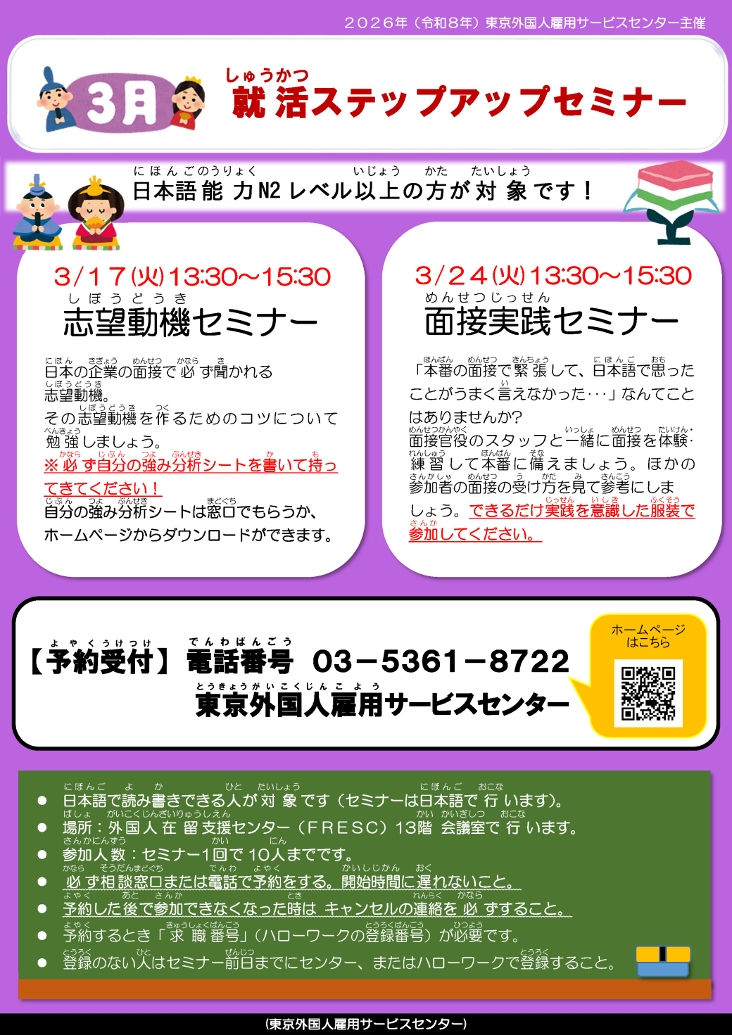 日本語能力N2レベル以上の方、日本語で読み書きできる方が対象です(セミナーは日本語で行います)。