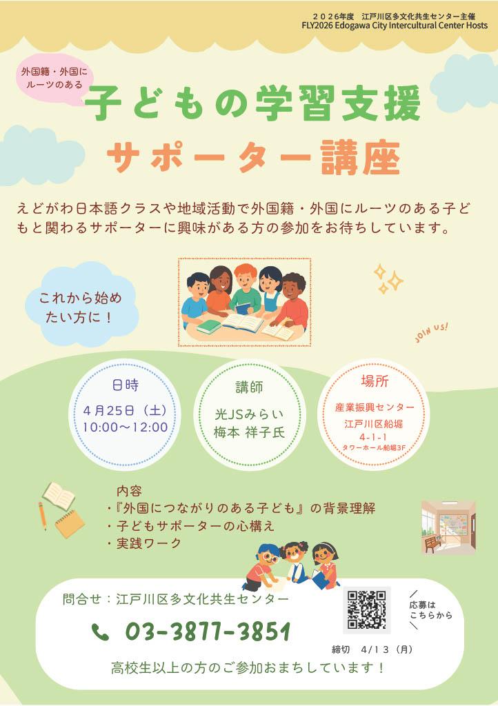 えどがわ日本語クラスや地域活動で外国籍・外国にルーツのある子どもと関わるサポーターに興味がある方の参加をお待ちしています。
