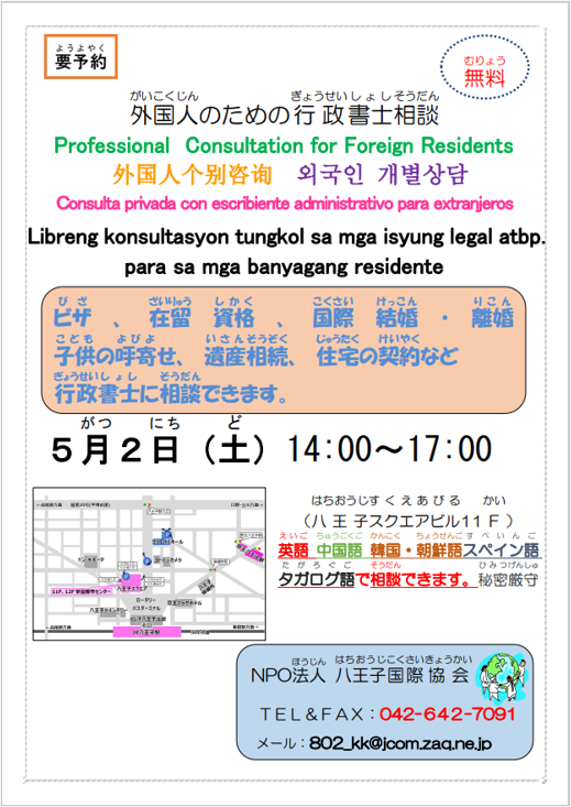 【八王子市】外国人のための弁護士相談会[ 5月 2日(土曜日)]