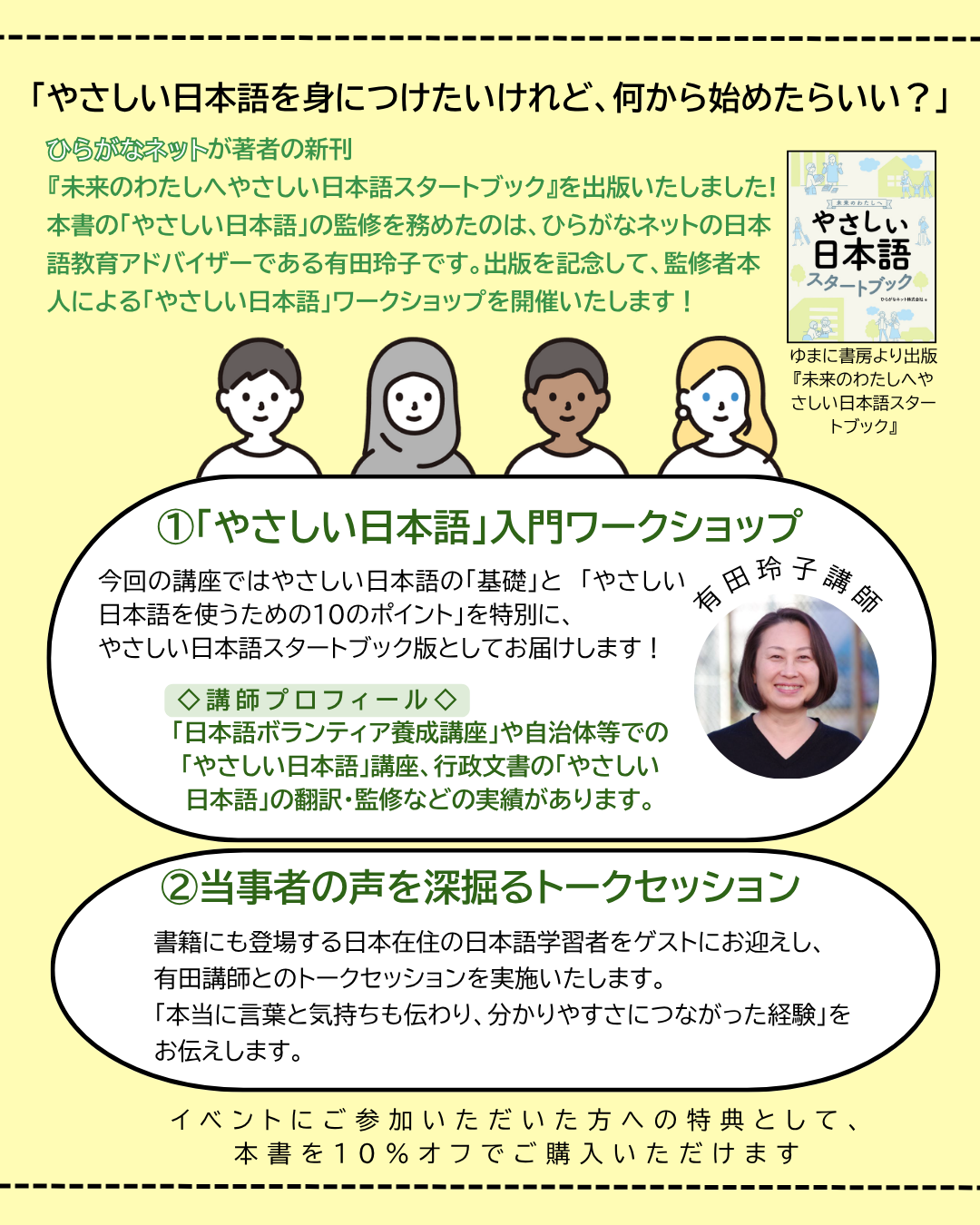 この度、ひらがなネットから新刊『未来のわたしへやさしい日本語スタートブック』を出版いたしました。本書の「やさしい日本語」の監修を務めたのは、ひらがなネットの日本語教育アドバイザーである有田玲子です。